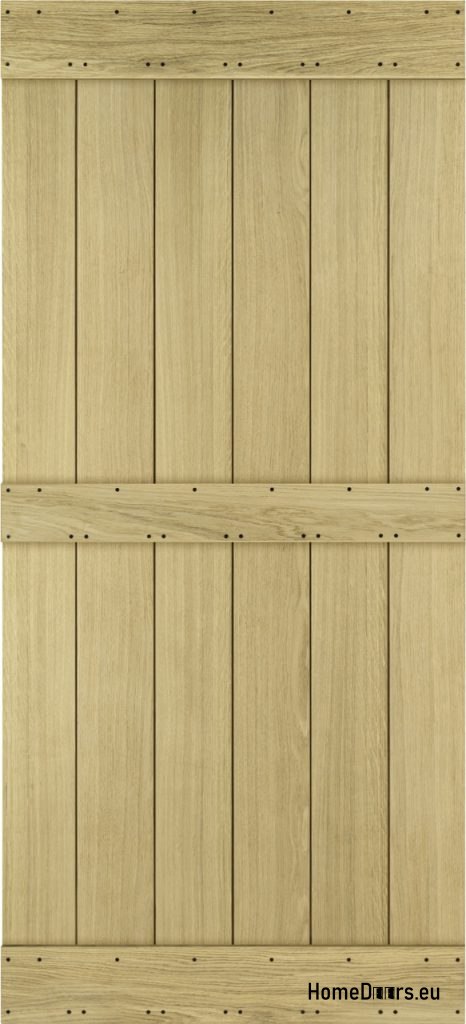 Drzwi o konstrukcji deskowej oklejone naturalnym fornirem. Krawędzie desek zdobi drewno naturalne wybranych gatunków. Drzwi wykończone bezpiecznym dla zdrowia i otoczenia, matowym olejem bezbarwnym, o wysokiej odporności na ścieranie. Skrzydło z jednej strony jest gładkie.