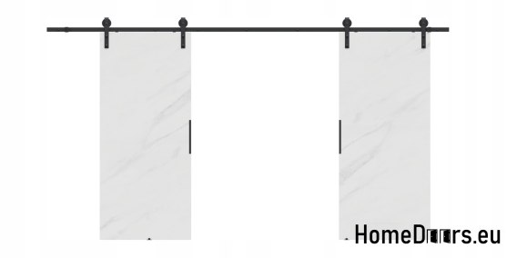 W zestawie otrzymujesz kompletne drzwi przesuwne 140 cm – skrzydło w kolorze Marmuru Białego + czarny system przesuwny LOFT 01 + uchwyt i prowadniki.